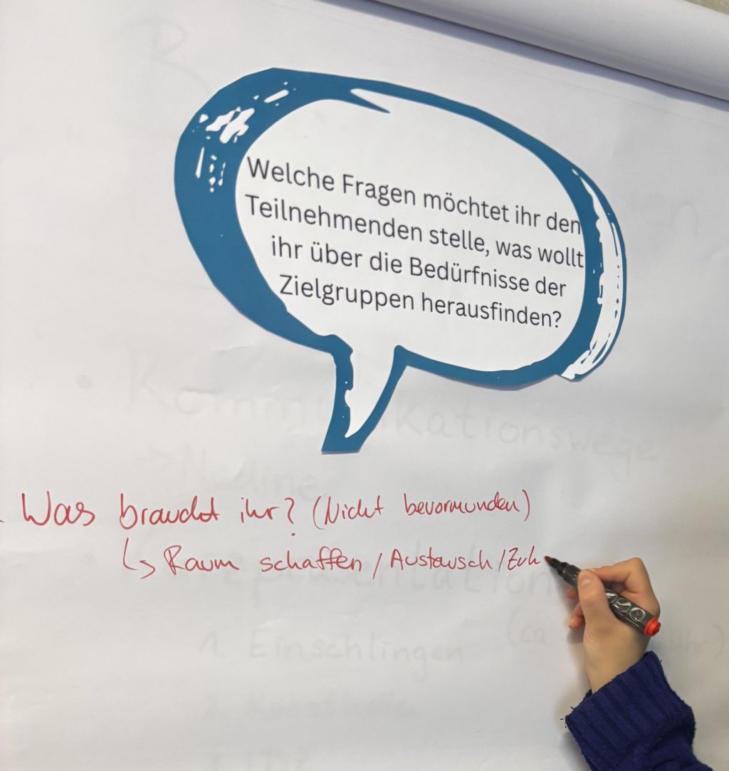 Von den drei Einrichtungen akquirierte Teilnehmende werden als Expert:innen in den Konzeptionsprozess der Angebote mit eingebunden. Die von ihnen analysierten Bedarfe fließen in die Konzeption der Veranstaltungen mit ein.